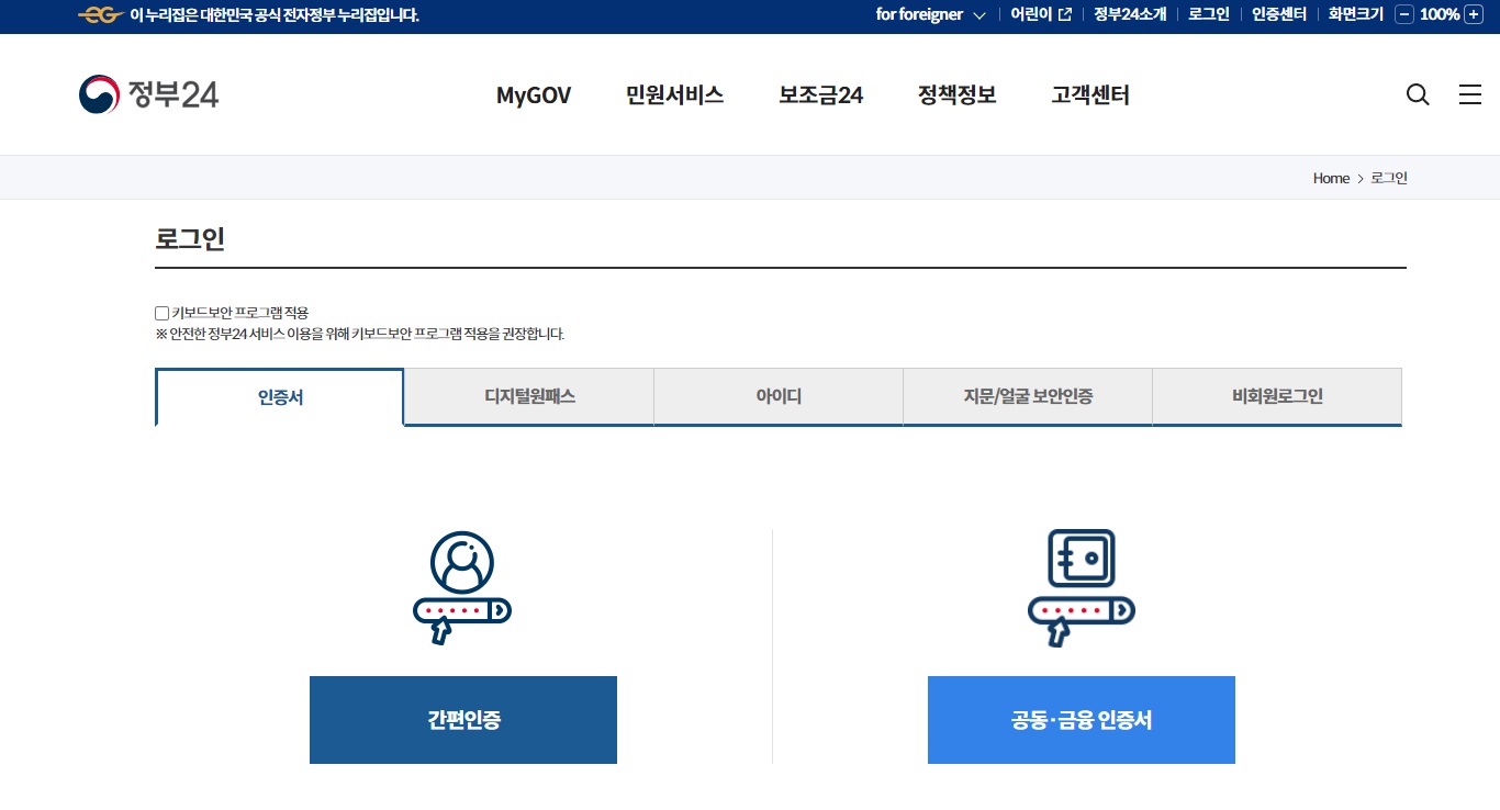 정부 24 사이트에 로그인을 합니다.