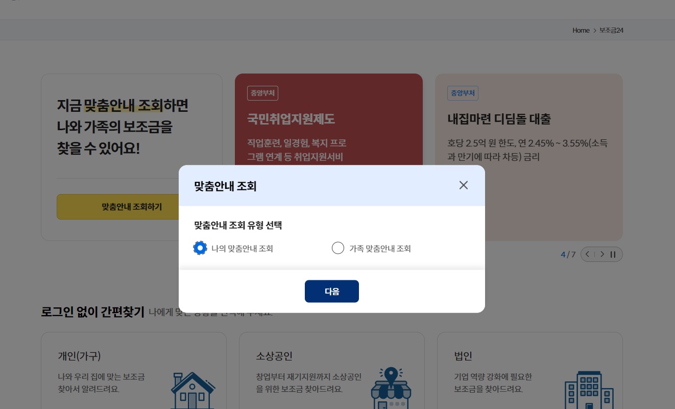 복잡하게 이런저런 사이트 찾아가지 마시고, 이제 맞춤형으로 정부 지원금을 받을 수 있는 방법을 찾아가실 수 있습니다.
