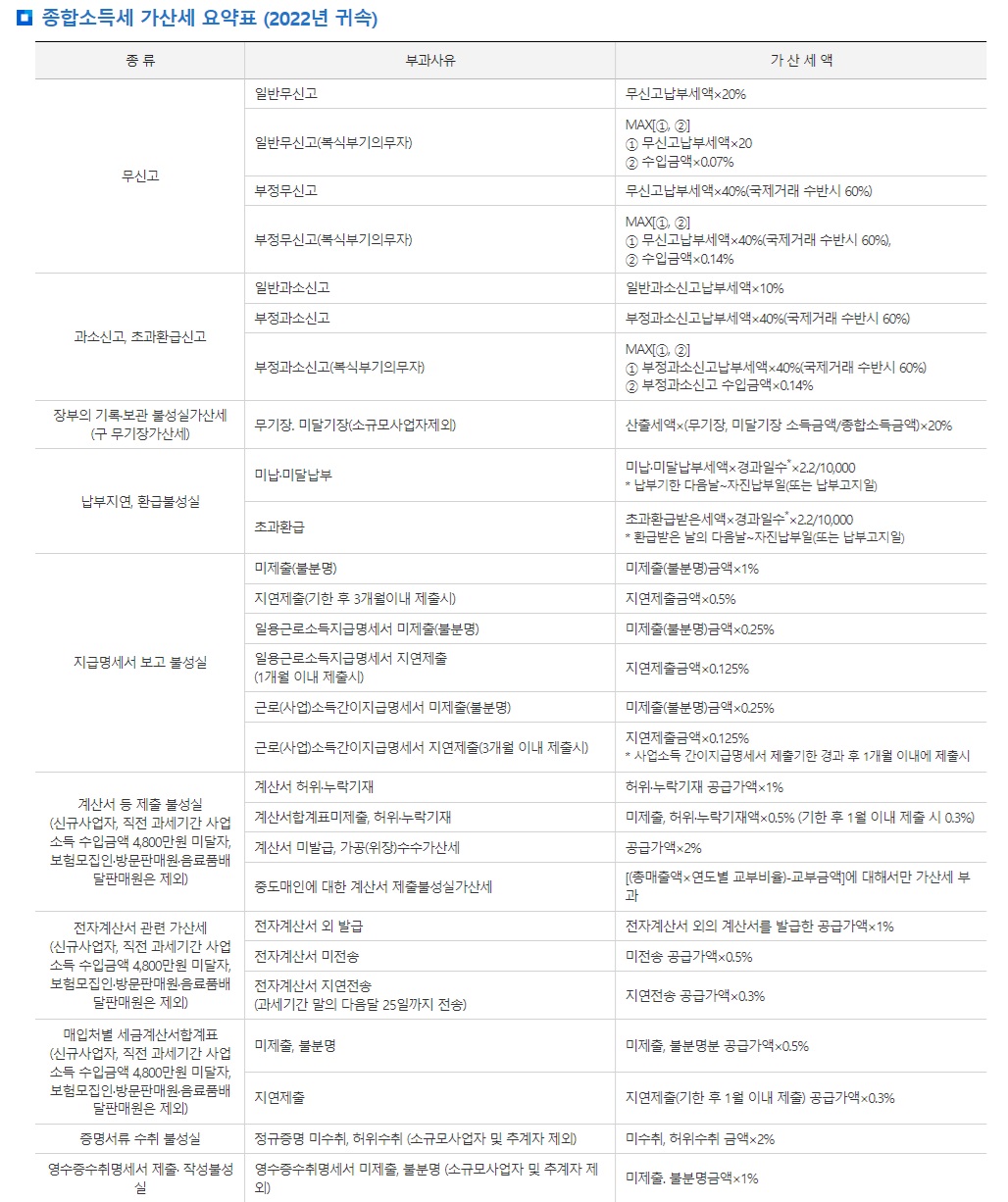 종합소득세를 제때 신고하지 않거나 누락시키게 되면 다음과 같은 가산세가 붙습니다.